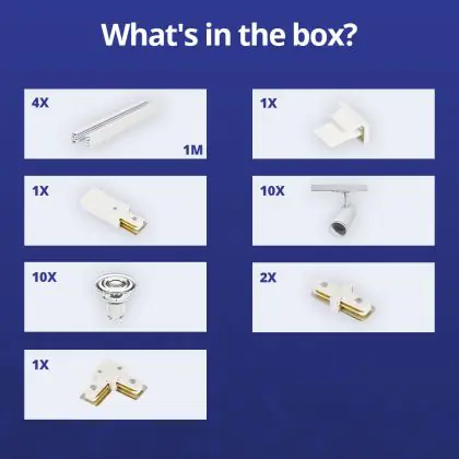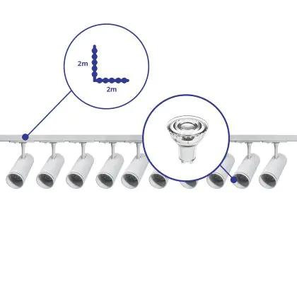 | Fabrikantnaam | Complete L shaped 1-Phase Track Set White incl. 10x Spot fixture + GU10 2700K 3W Dim – 2 x 2 meters | |