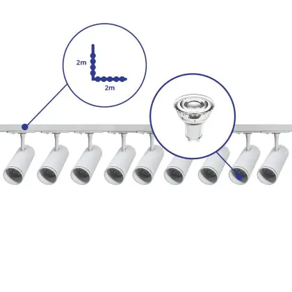 | Fabrikantnaam | Complete L shaped 1-Phase Track Set White incl. 9x Spot fixture + GU10 2700K 3W Dim – 2 x 2 meters i | |